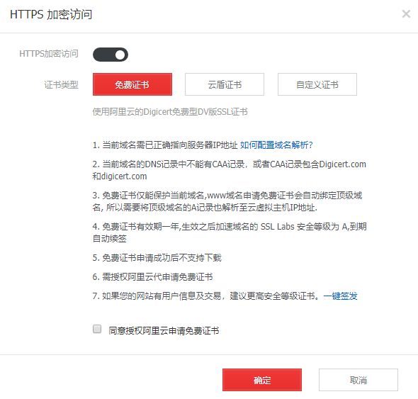 登錄萬網(wǎng)/阿里云cp.aliyun.com主機控制面板-域名管理-添加域名(解析和備案成功的)-再點強制HTTPS加密訪問-開啟-根據(jù)提示點確定(如果你的證書在阿里申請的,只管等待安裝結(jié)果)