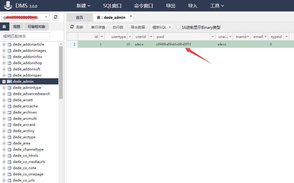 二、打開數(shù)據(jù)庫表,找到dede_admin這個(gè)數(shù)據(jù)表,將原來存在密碼替換為:例如:123456,數(shù)據(jù)庫里顯示就是:c3949ba59abbe56e057f,直接更新到數(shù)據(jù)庫密碼pwd下如圖:
