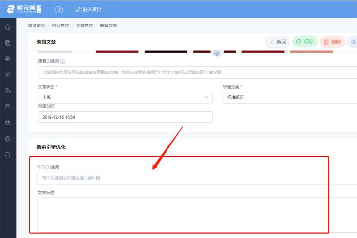 產(chǎn)品標(biāo)題或文章標(biāo)均為入庫(kù)時(shí)的名稱(chēng),但詳情頁(yè)的描述和關(guān)鍵詞定義需要在“搜索引擎”優(yōu)化處填寫(xiě),如下圖所示: