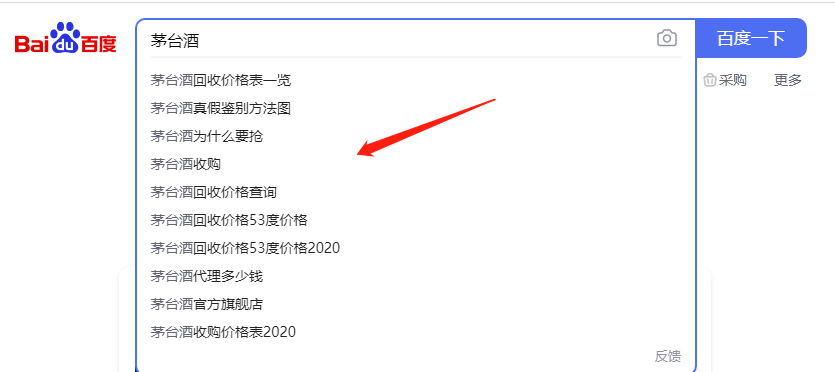 舉例說(shuō)明,當(dāng)訪客在百度搜索引擎輸入“茅臺(tái)酒”這兩個(gè)字的時(shí)候,搜索引擎就從推薦詞條庫(kù)中檢索出以“茅臺(tái)酒”這兩個(gè)字打頭的詞條,并根據(jù)搜索量從大到小排序,組建成下拉菜單。搜索引擎下拉菜單的最大數(shù)量為 10 條。